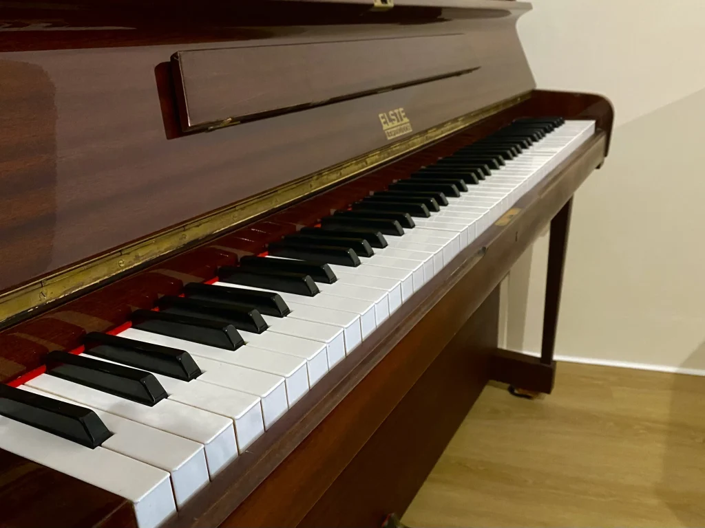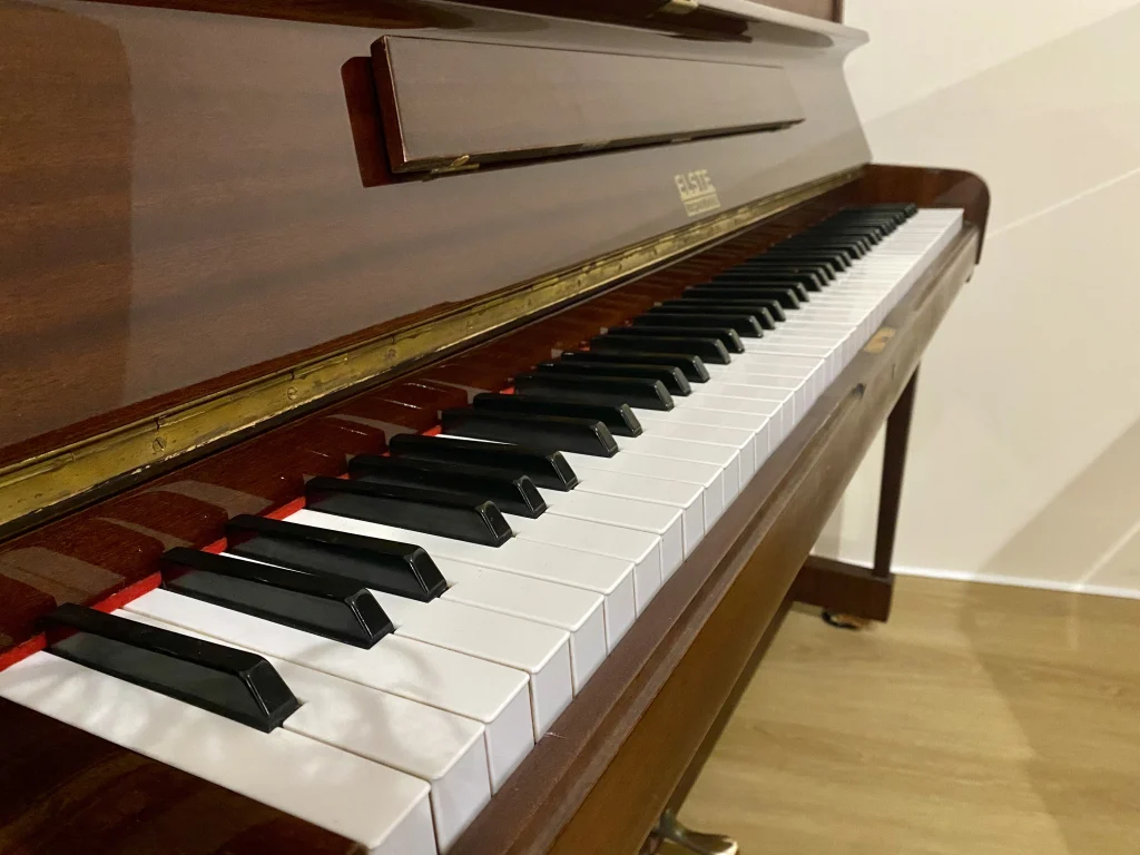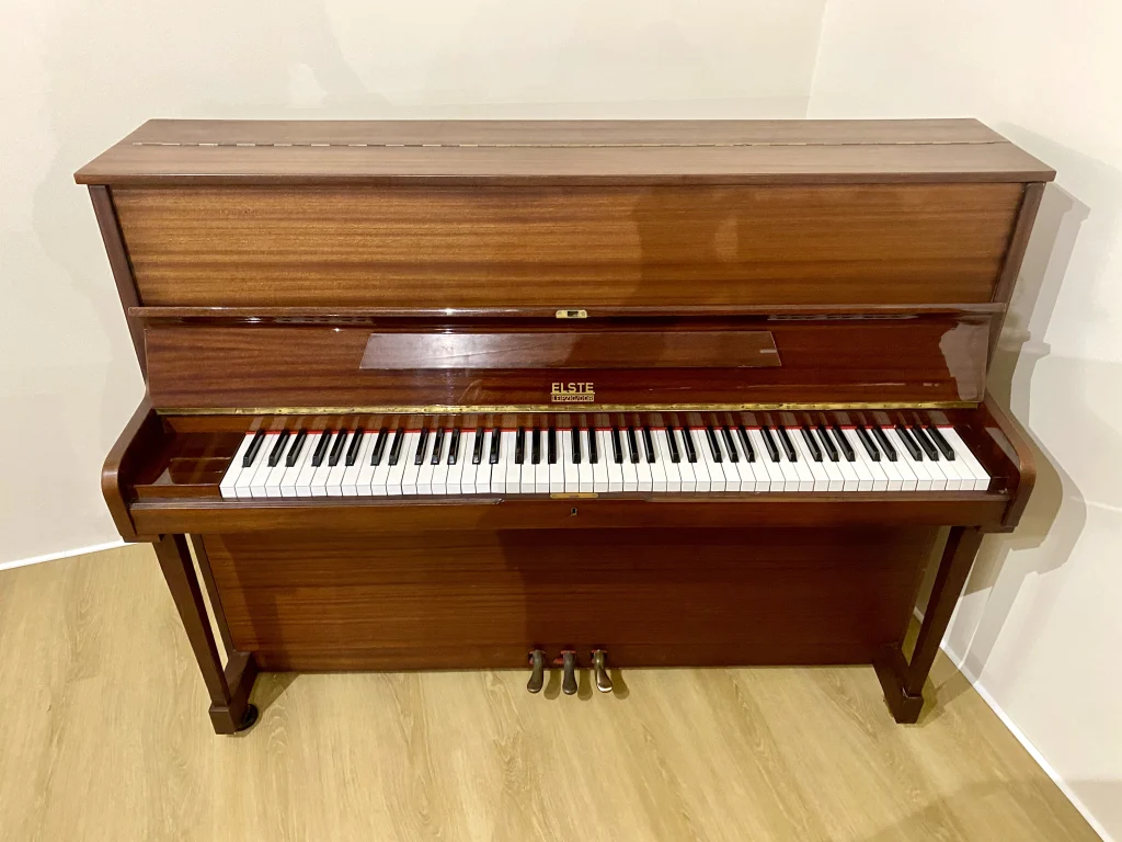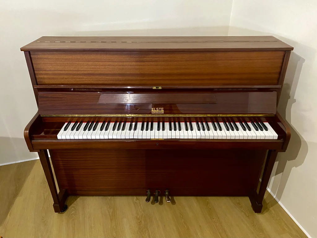 Eleganza e suono equilibrato si incontrano in questo pianoforte verticale Elste 118 con raffinata finitura noce satinato, ideale per chi cerca uno strumento affidabile e dal buon impatto estetico.